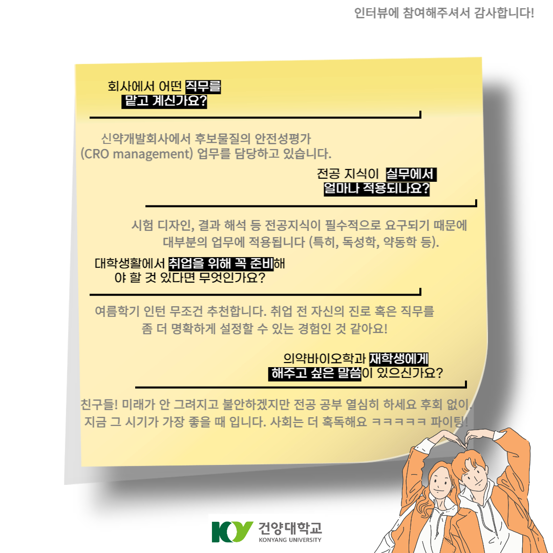 『 의약바이오학과 졸업생 인터뷰 [5편] 』글의 상세내용을 확인하는 표로 제목, 부서명, 등록일, 조회, 첨부, 내용으로 나뉘어 설명합니다.