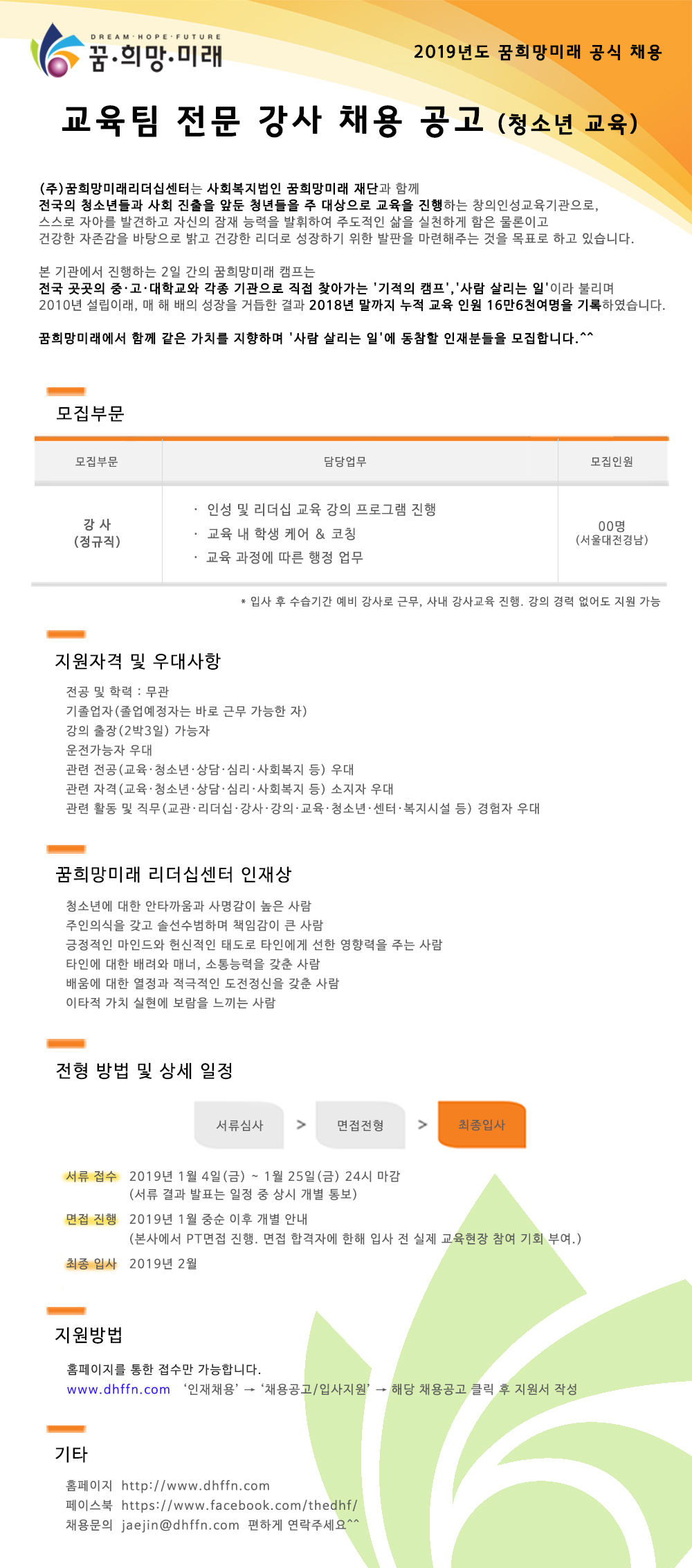 | 제목 | (~1/25)꿈희망미래재단 교육팀 전문강사 채용 공고 안내 | ||||
