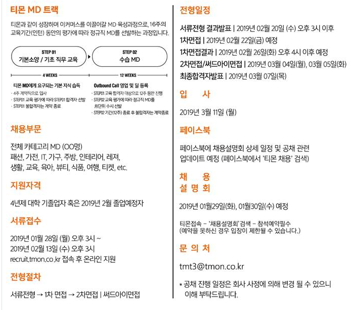 『 티몬 MD 신입공채 안내 』글의 상세내용을 확인하는 표로 제목, 부서명, 등록일, 조회, 첨부, 내용으로 나뉘어 설명합니다.