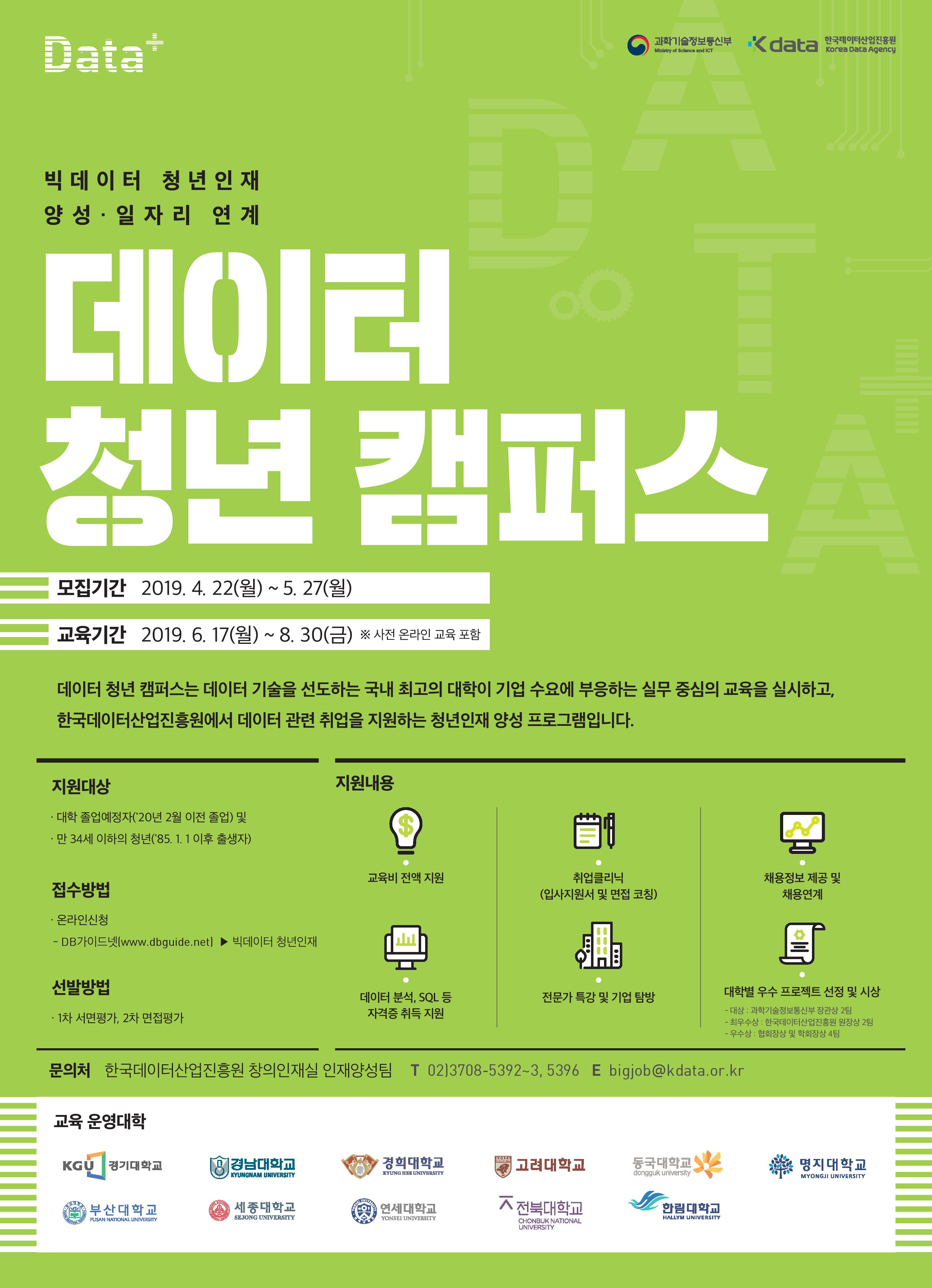 | 제목 | (~5/27)2019 데이터 청년 캠퍼스(빅데이터 청년인재 일자리 연계 사업)교육생 모집 안내 | ||||
