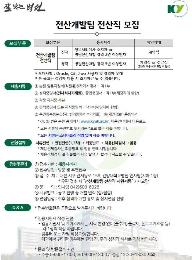 | 제목 | 건양대학교 병원 전산직 채용 안내 | ||||