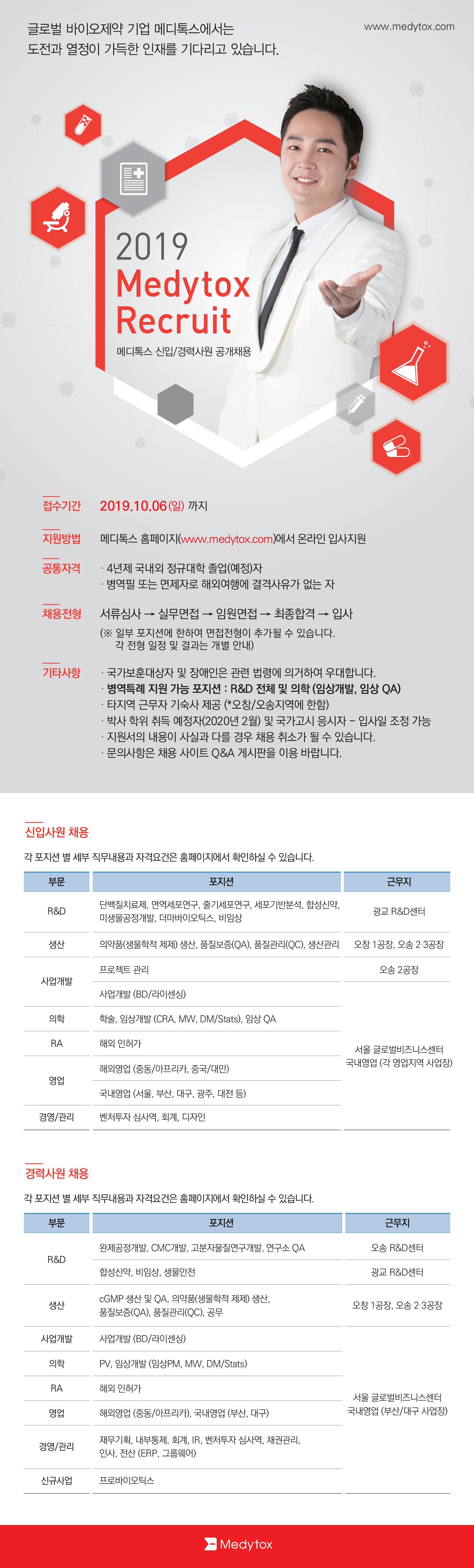 제목 (~10/6) [메디톡스] 2019 하반기 신입/경력 공개채용 안내