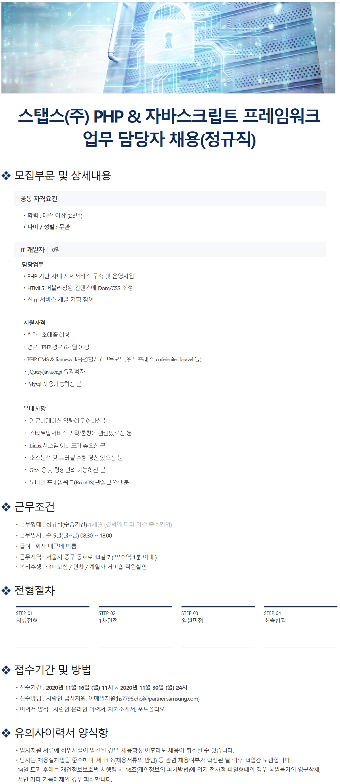 [스탭스(주)]PHP&자바스크립트 프레임워크 담당자 채용 글의 상세내용