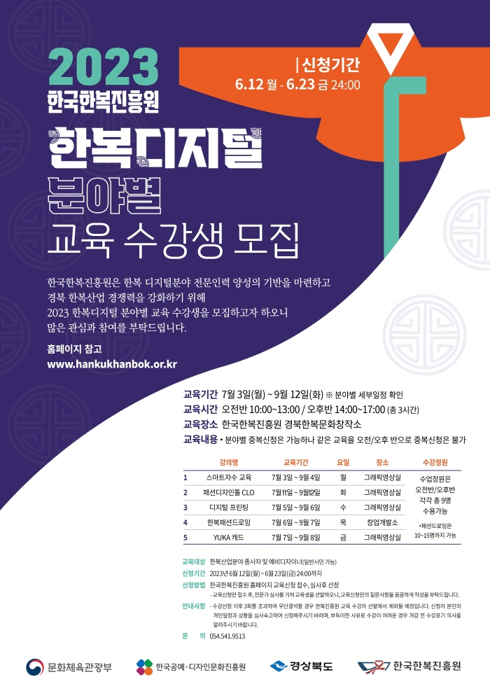 | 제목 | [한국한복진흥원] 2023 경북한복문화창작소 참여자 모집 | ||||