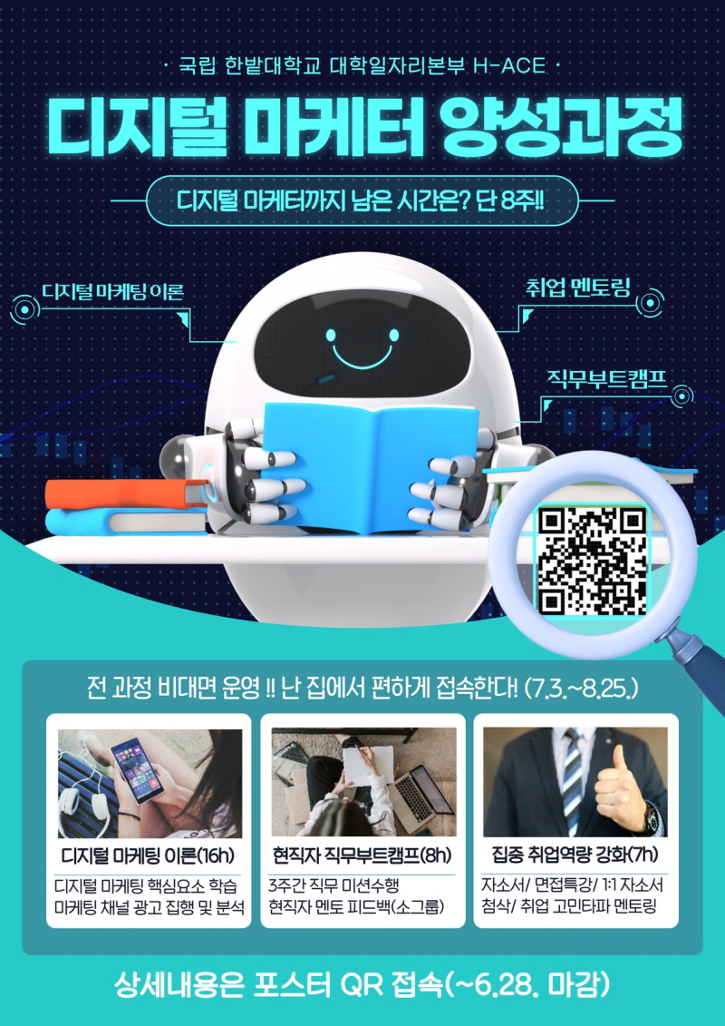 프로그램명 | 2023 디지털 마케터 양성 온라인 과정 | 모집대상 | 지역청년, 재학생, 졸업생 *지역청년, 졸업생, 고학년 우선선발 | 모집기간 | 2023. 6. 16.(금) ~ 6. 28.(수)까지/ 선발발표 : 2023. 6. 29. (개별 SMS안내) (모집상황에 따라 추가 모집 또는 조기마감 될 수 있으며, 상세 내용은 안내페이지 참고) | 운영기간 | · 프로그램 사전 설명회 : 2023. 6. 23.(수)/ *필수 참여교육 아니며 교육 이해도 제고 목적 · 교육일정 : 2023. 7. 3.(월) ~ 8. 25.(금), 총 31h ※ 사후관리는 개인별 맞춤형으로 별도 진행 | 운영방법 | 전 과정 비대면 운영 | 주요내용 | · 디지털 마케팅 이론 및 응용과정(16h)+일경험 프로젝트 수행 및 현직자 개별 피드백(3주) · 집중 취업역량 강화로 실질적인 구직활동 지원(7h) | 안내 URL | · 디지털 마케터 양성 온라인 과정 상세 안내페이지 https://lrl.kr/jhZn · 디지털 마케터 양성 온라인 과정 온라인 신청 폼 https://lrl.kr/jhZl | 협조 요청사항 | · 디지털 마케터(퍼포먼스 마케터 등) 관련 학과 안내 · 공식 홈페이지 및 취업정보 관련 SNS 공지 | 문 의 | 취업지원관 안정현, 042-828-8624 |