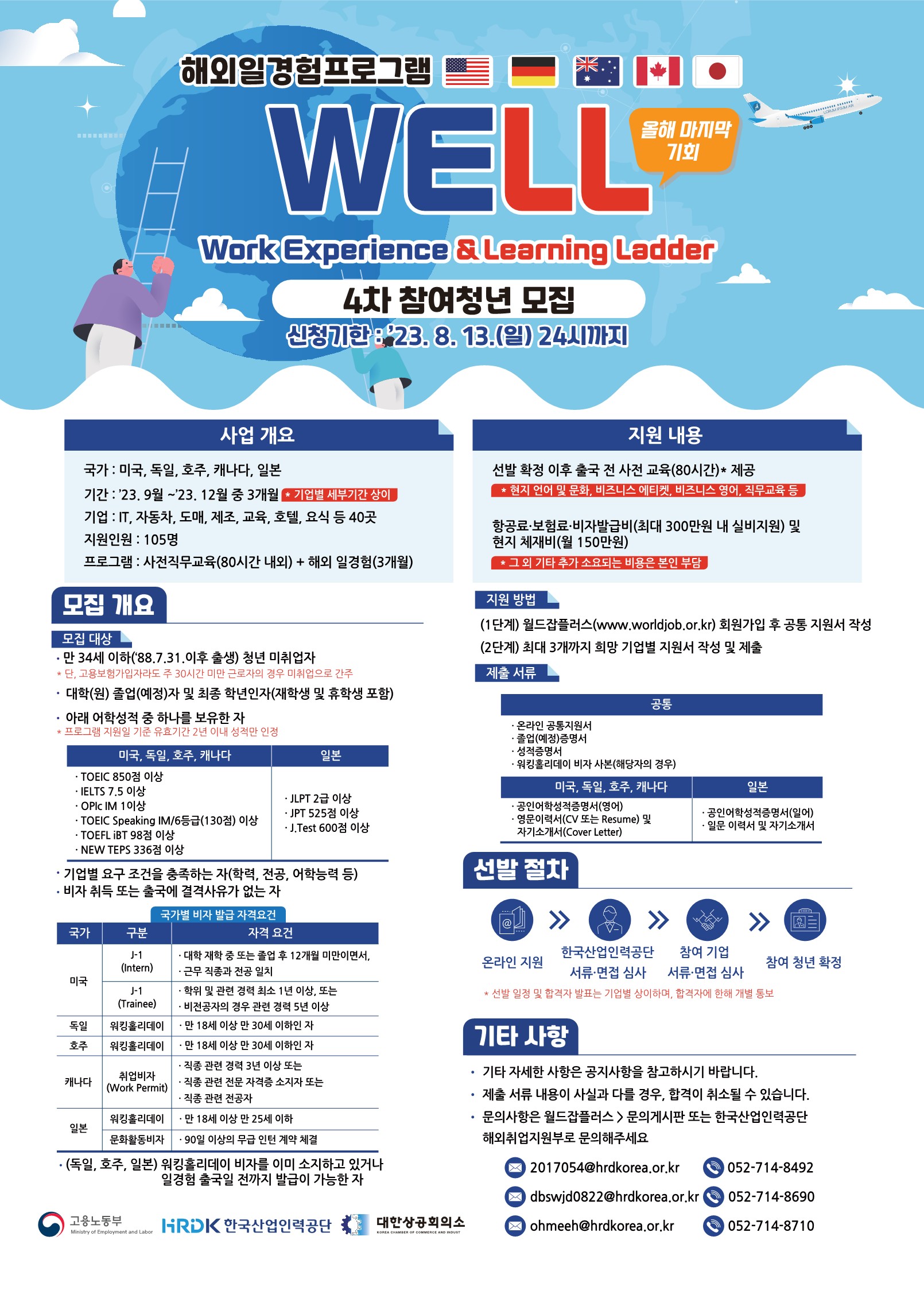 ○ 사업명 : WELL(Work Experience & Learning Experience) ○ 주최/주관 : 고용노동부/대한상공회의소·한국산업인력공단 ○ 대상국가 : 미국, 독일, 호주, 캐나다, 일본 ○ 참여기업 : IT, 도매, 제조, 교육, 호텔, 요식 등 업종 40개 기업 ○ 참여청년 : 만 34세 이하 대학(원) 졸업(예정)자 및 최종학년인 자(재·휴학생 포함) 105명 ○ 사업내용 : 사전교육(80시간 내외) + 해외 일경험(3~4개월) ○ 청년지원금 : 준비금(최대 300만원)*, 일경험 기간 동안의 체재비(월 150만원) * 항공료, 보험료, 비자발급비 총계 최대 300만원 내 실비 지원(초과 비용 본인 부담)