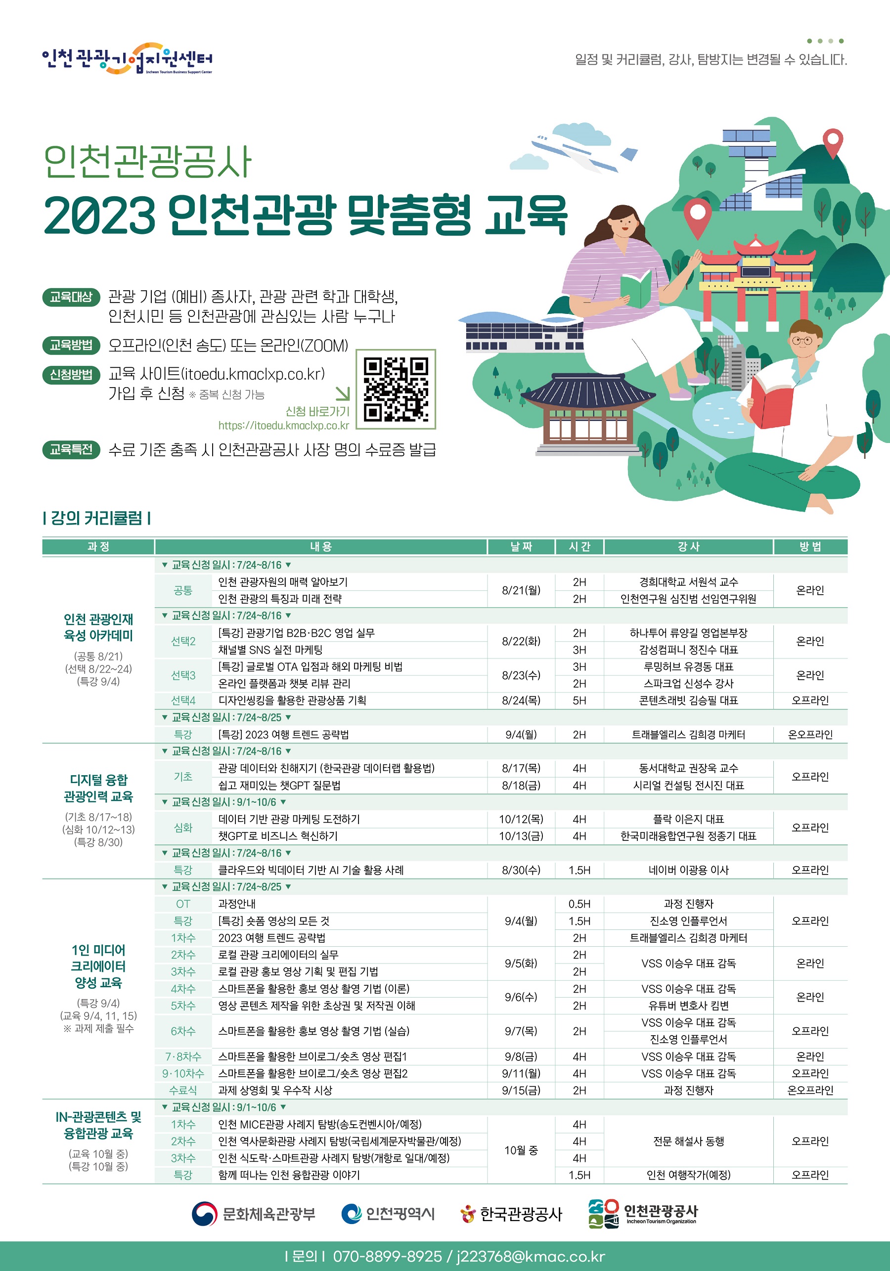 ○ 교육 개요 가. 교육대상 : (예비)관광종사원 및 관광분야에 관심 있는 일반시민, 관광부문 관련 학생, 취업준비생 등 나. 교육장소 : (오프라인 강의) 인천광역시 연수구 인천스타트업파크 인스타Ⅰ (인천대입구역 4번출구) 다. 교육방법 : 1) 디지털 융합관광인력 교육(오프라인), 2) 인천 관광인재 육성 아카데미(온오프라인 병행) 라. 교육특전 : 과정별 기준에 따라 수료 완료 시 인천관광공사 사장 명의 수료증 발급 마. 신청과정 : 1) 인천 관광인재 육성 아카데미 (8월21일~24일, 9월4일 실시): 온오프라인 교육 - 관광영업·마케팅, 스마트관광, 관광상품기획 등 - 관광상품기획(선택과정4) 과정만 오프라인 교육 실시 (8월24일) - 특강(9월4일) : 2023 여행 트렌드 공략법 (트래블엘리스 김희경 마케터) 2) 디지털 융합 관광인력 교육 (8월17일~18일, 8월30일 실시): 오프라인 교육 - 기초과정 : 관광데이터와 친해지기, 쉽고 재미있는 챗GPT 질문법 ※ 실습 교육이므로 노트북 지참 권장 - 특강(8월30일) : 클라우드와 빅데이터 기반 AI 기술 활용 사례 (네이버 이광용 이사)