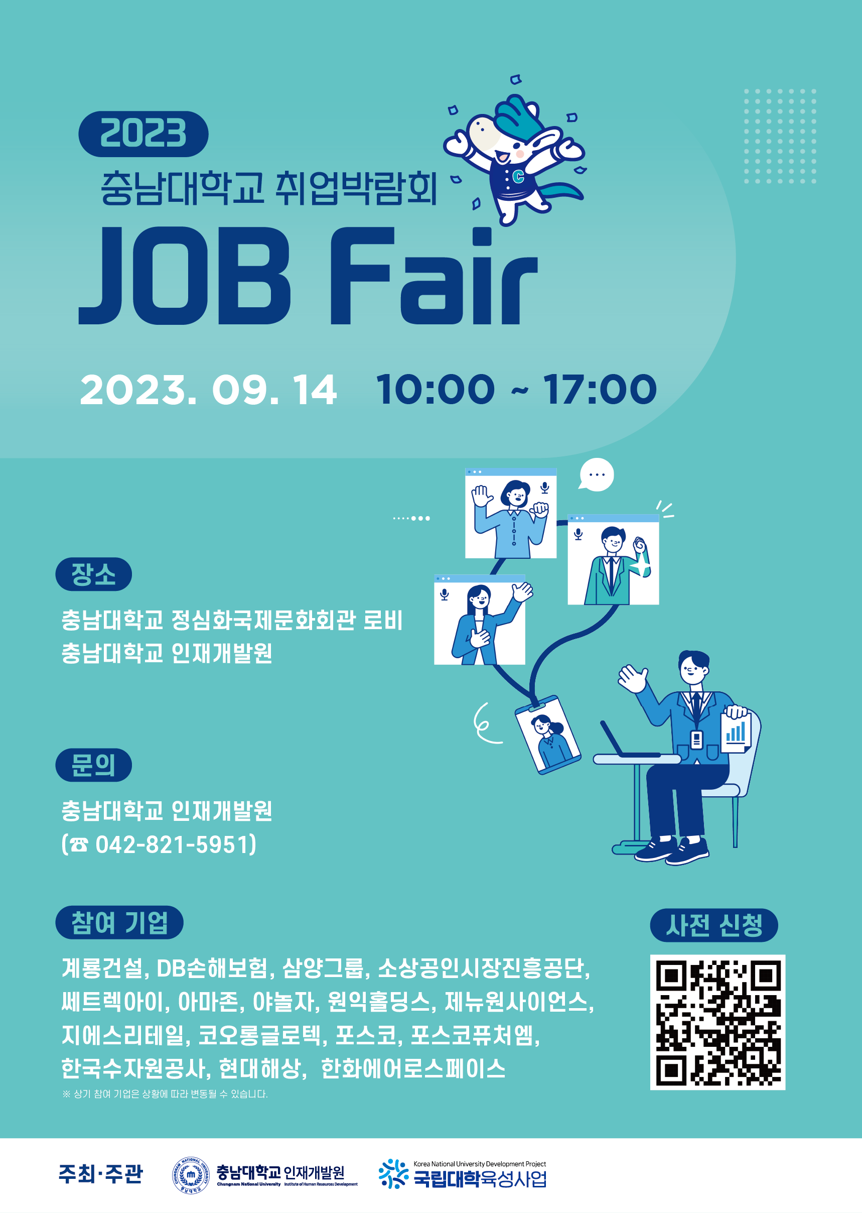 가. 행 사 명: 2023년 충남대학교 취업박람회 나. 운영일정: 2023. 9. 14.(목) 10:00~17:00 다. 운영장소: 충남대학교 정심화국제문화회관 로비, 인재개발원 라. 참여대상: 충남대학교 재학생 및 졸업생, 지역청년 마. 주 최: 충남대학교 인재개발원 바. 운영부스 - 채용관: 계룡건설, DB손해보험, 삼양그룹, 소상공인시장진흥공단, 쎄트렉아이, 아마존, 야놀자, 원익홀딩스, 제뉴원사이언스, 지에스리테일, 코오롱글로텍, 포스코, 포스코퓨쳐엠, 한국수자원공사, 현대해상, 한화에어로스페이스 - 행사관: 테마 및 홍보 부스 사. 운영내용: 기업 채용정보 제공 및 채용면담 아. 신청방법: 구글 폼 작성(https://forms.gle/N2cc4GoL2TjYAhqN7)