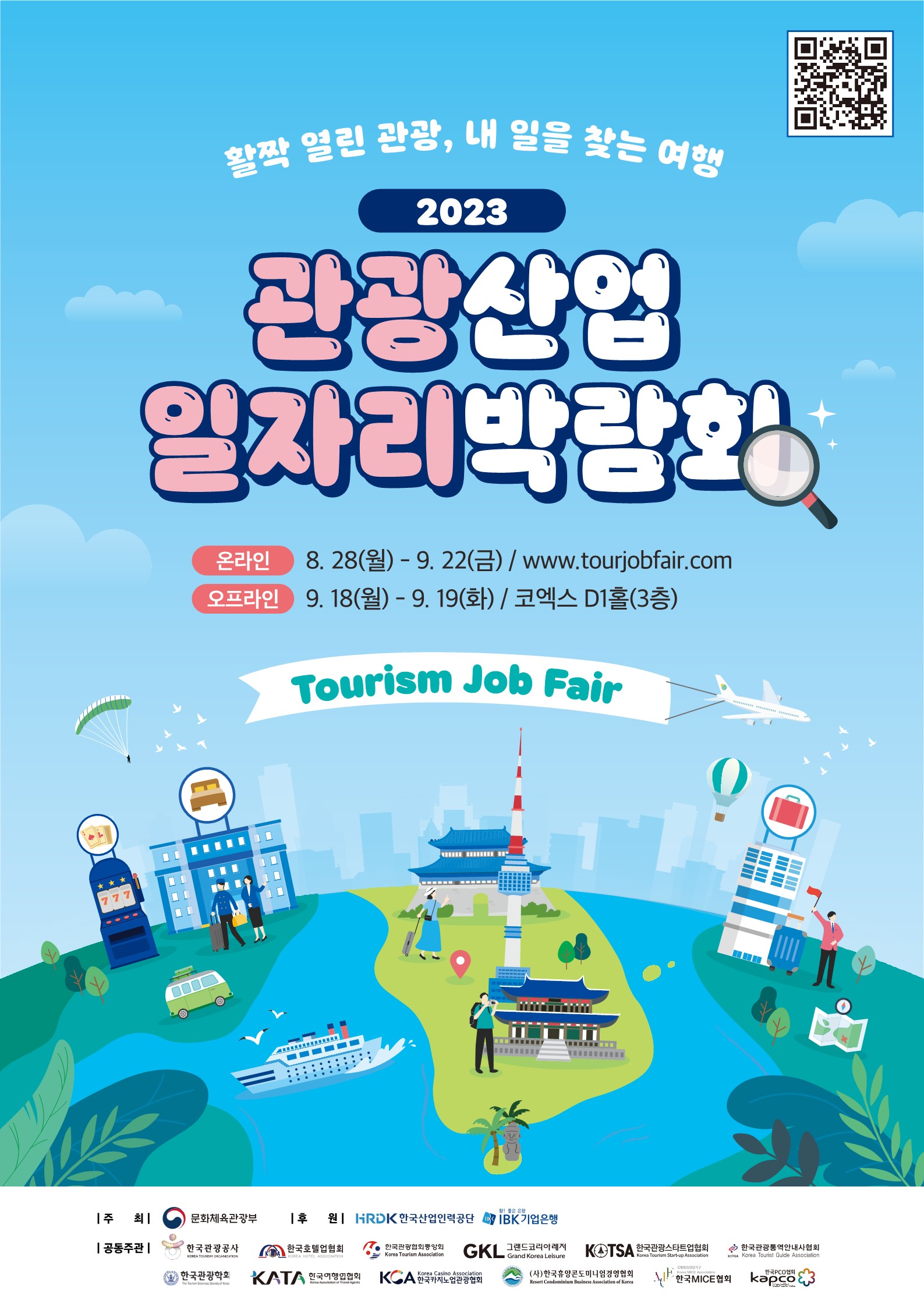 가. 박람회 개요 1) 행 사 명 : 2023 관광산업 일자리박람회 2) 기간/장소 가) 온라인 : 2023. 8. 28.(월) ~ 9. 22.(금), 4주간 / www.tourjobfair.com 나) 오프라인 : 2023. 9. 18.(월) ~ 9.19.(화), 2일간 / 서울 COEX 3층 D1홀 3) 주 최 : 문화체육관광부 4) 공동주관 : 한국관광공사, 한국호텔업협회, 한국관광협회중앙회, 그랜드코리아레저 한국관광스타트업협회, 한국관광통역안내사협회, 한국관광학회, 한국여행업협회, 한국카지노업관광협회, 한국휴양콘도미니엄경영협회, 한국MICE협회, 한국PCO협회 5) 후 원 : 한국산업인력공단, IBK기업은행