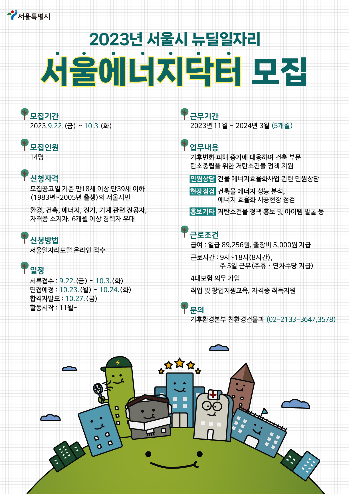가. 건 명 : 2023년 서울형 뉴딜일자리 서울에너지닥터 나. 모집인원 : 14명 다. 모집대상 : 당해연도 만 18세 이상 만 39세 이하 서울시민 - 신청자격 : 졸업생, 졸업예정자 신청 가능 ※ 재학생, 휴학생은 참여 불가 - 우대사항 : 환경, 건축, 에너지, 전기, 기계 관련 전공자, 자격증 소지자, 6개월 이상 경력자 라. 주요역할 : 저탄소건물사업(민간BRP융자지원, 노후주택에너지효율화지원) 민원상담, 건물에너지효율화 시공 현장 점검, 저탄소건물정책 홍보 등 마. 모집기간 : 2023. 9. 22.(금) ~ 10. 3.(화) 바. 신청방법 : 서울일자리포털(https://job.seoul.go.kr) 온라인 접수