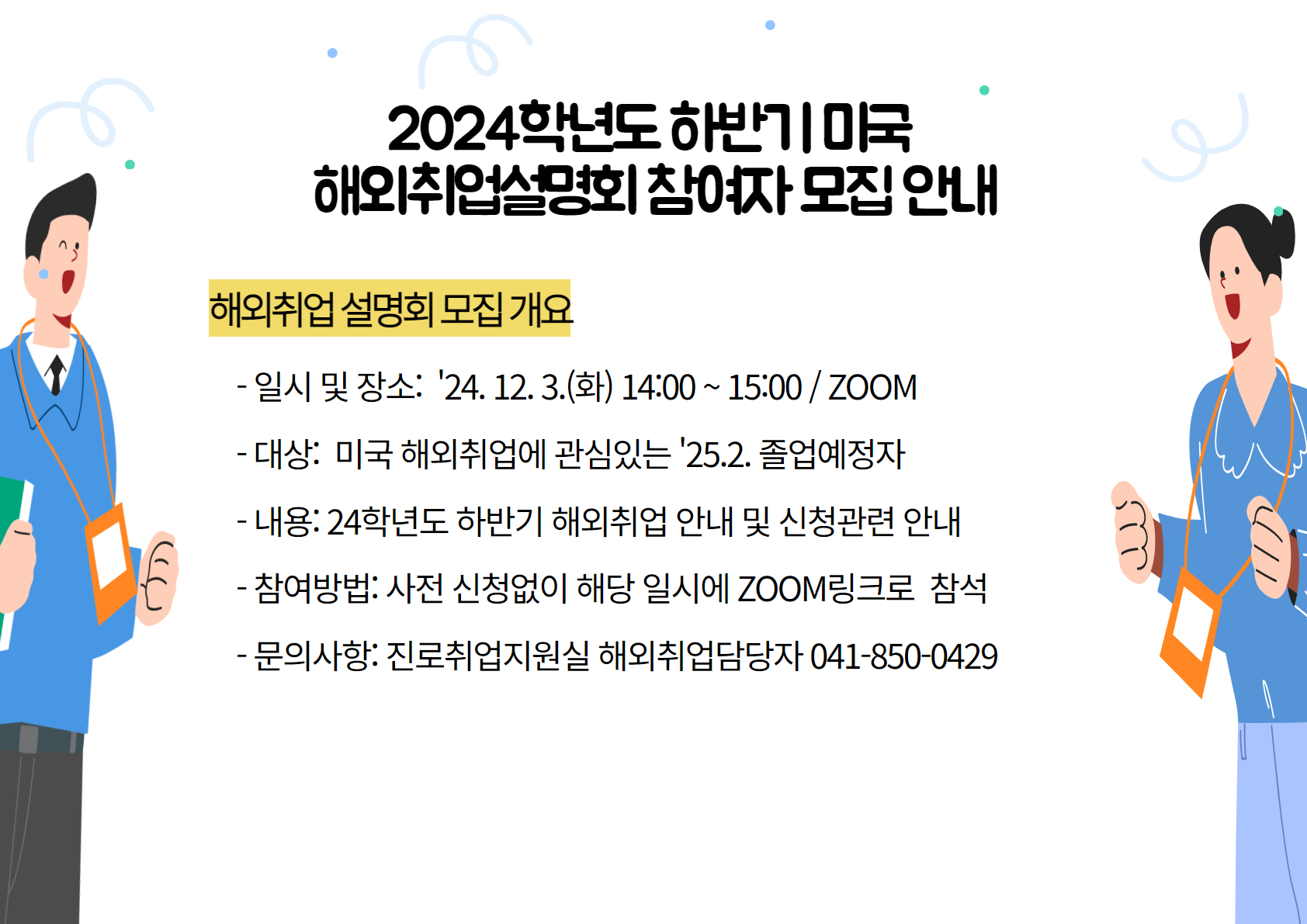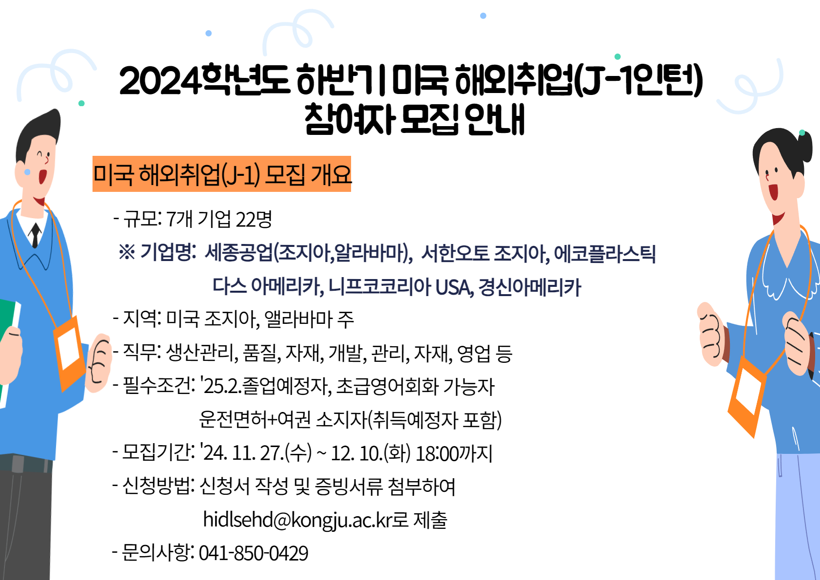 | 제목 | 24학년도 하반기 미국 해외취업(J-1인턴) 참여자 모집 및 설명회 참여 안내 | ||||