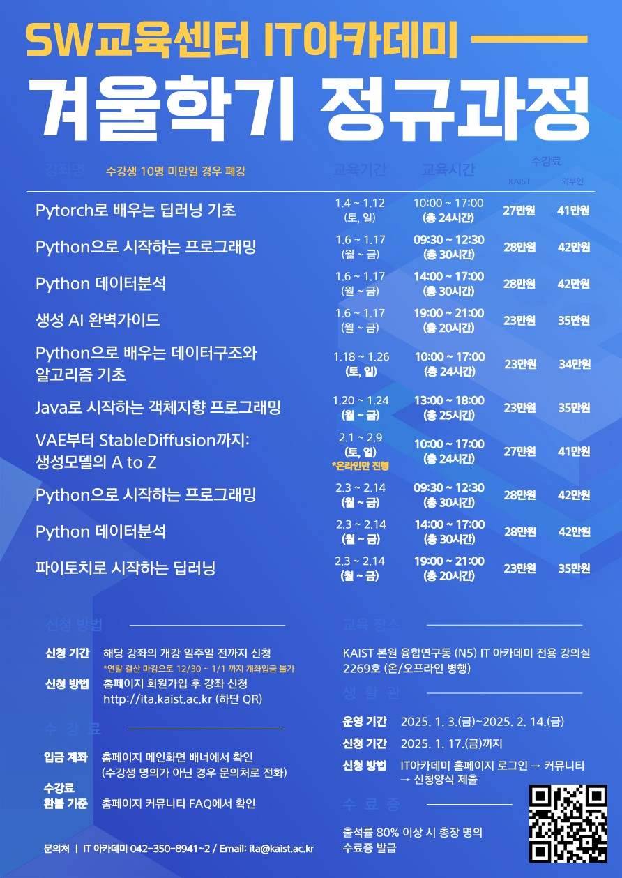가. 대상: 직장인, 연구원, 대학원생 등 일반인 대상 나. 신청기간 및 방법 1) 기간: 해당 강좌의 개강 일주일 전까지 신청 2) 방법: KAIST IT아카데미 홈페이지 회원가입 후 강좌 신청(https://ita.kaist.ac.kr) 다. 교육기간 및 장소 1) 기간: 강좌별 상이하므로 포스터 참고(강좌당 20시간~30시간) 2) 장소: KAIST 본원 융합연구동 N5 2269호 or Zoom 라. 주요내용 1) Python으로 시작하는 프로그래밍 2) Pytorch로 배우는 딥러닝 기초 3) 생성 AI 완벽가이드 등 ※ 강좌별 내용 및 수강료가 상이하므로 자세한 내용은 포스터 참고 마. 문의처 : KAIST SW교육센터 IT아카데미 사무국(042-350-8941, ita@kaist.ac.kr)