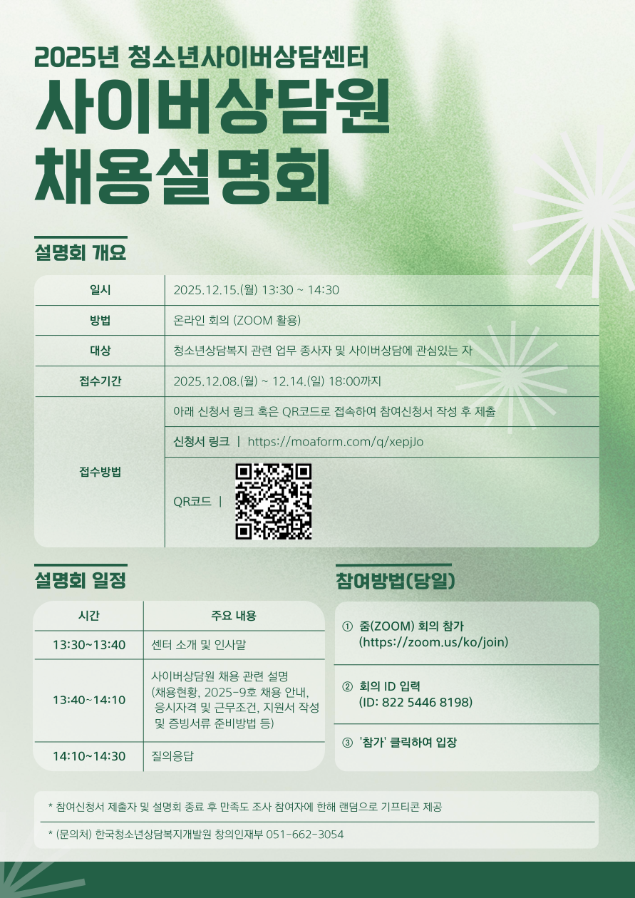 2025년 청소년사이버상담센터 사이버상담원 채용설명회 글의 상세내용