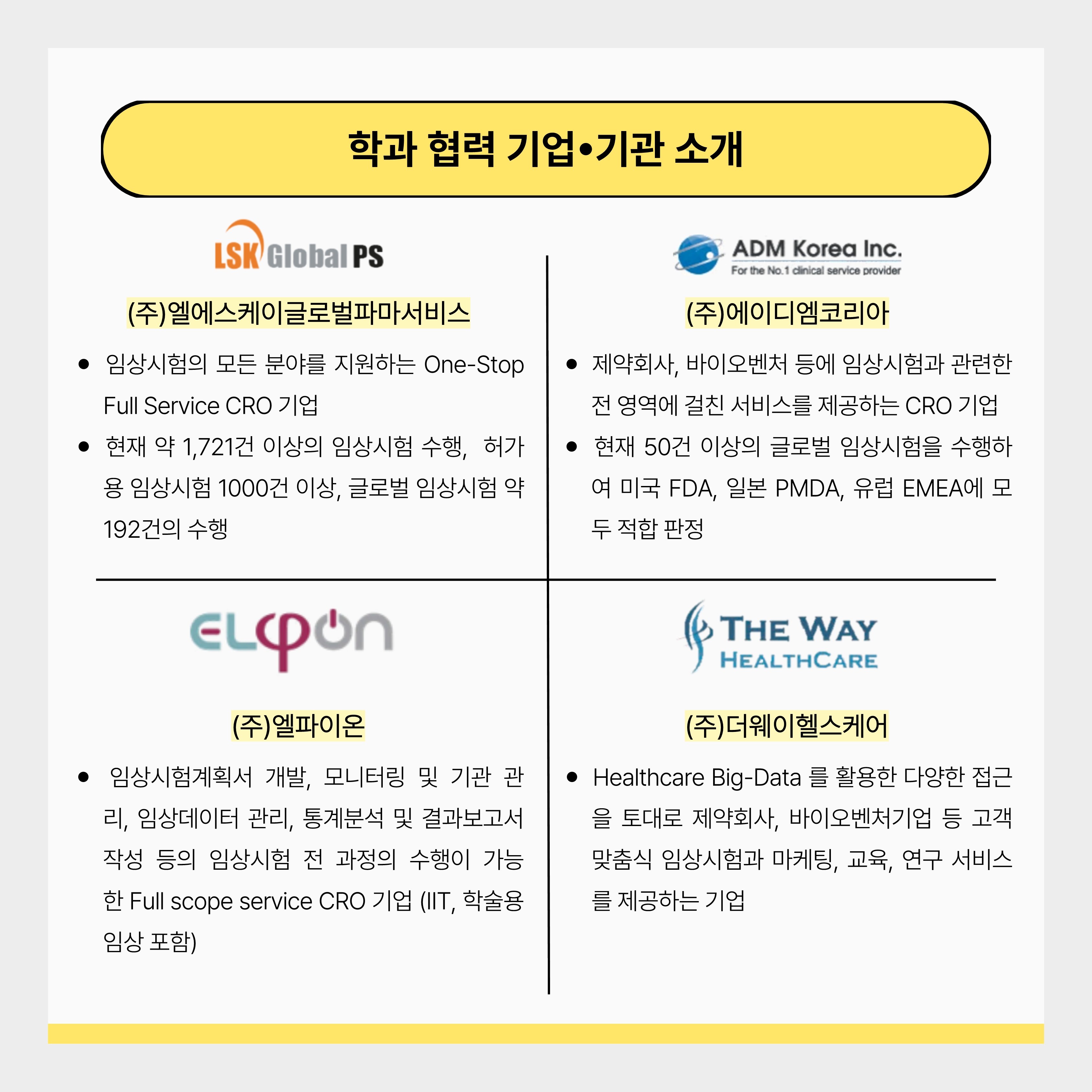 『 임상의약바이오학과 협력 기업ㆍ기관 소개 』글의 상세내용을 확인하는 표로 제목, 부서명, 등록일, 조회, 첨부, 내용으로 나뉘어 설명합니다.